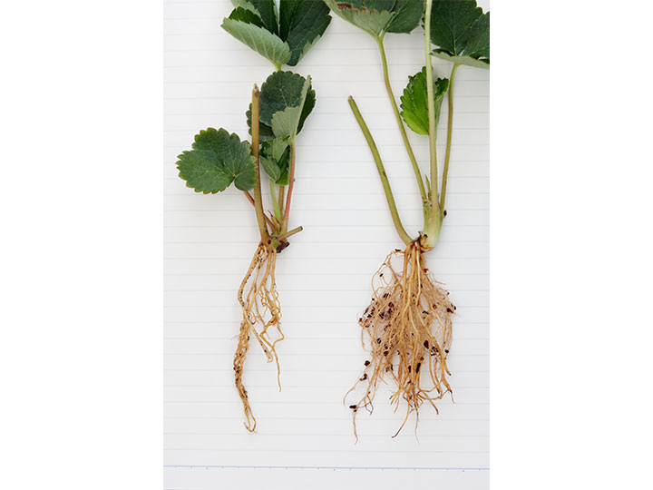 通常の培養土で育った根(左)、「ジフィーセブンC」で育った根(右)。差は歴然。
