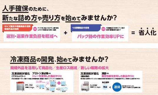 青果物の計量からパック詰めの自動化による省人化に対応する容器含めたご提案、販売手法や冷凍技術の活用で省人化に繋げるご提案、障がい者雇用の取り組み実例を踏まえた講演など、ご来場者様に有益な情報をご用意致しますので、是非ご来場くださいます様宜しくお願い致します。