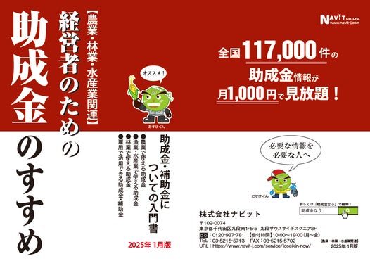 2025/2/1(土)より、【農業・林業・水産業事業者向け】「経営者のための助成金のすすめ」(2025年1月版)の販売が開始しております。助成金なうでは申請サポートを承っております。