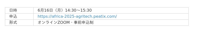 テーマは「アフリカ農家のための次世代アグリテック」。JICA等とも連携して世界の飢餓問題解決へ。スマート農業で、アフリカの食料安全保障と持続可能な農業に貢献。オンライン報告会も開催予定