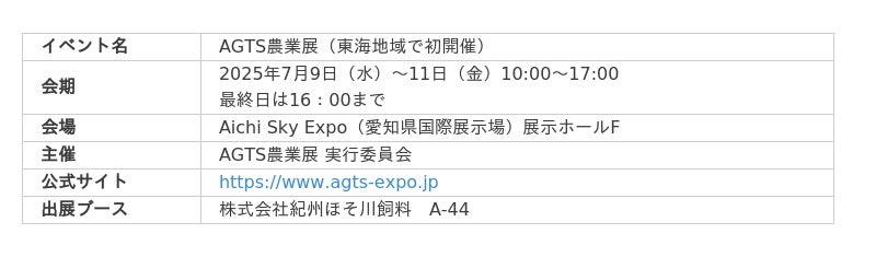 採卵鶏やブロイラーの健康を支え、生産性向上とコスト削減を同時に実現する本製品を、2025年7月9日(水)から開催される「AGTS農業展」(会場:Aichi Sky Expo 愛知県国際展示場)にて初出展いたします。事前登録の上、是非ブースにお越しください。