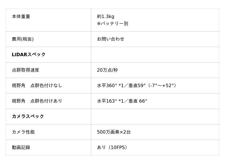 *1 センサー構造上、カラー付与時は視野中心(真正面)に一部点群欠損が発生します。計測方法によって補完可能です。