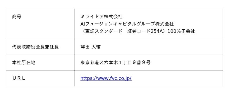 ミライドア株式会社(本社:東京都港区、代表取締役会長兼社長:澤田 大輔、以下「ミライドア」)は、おおさか創業2号投資事業有限責任組合(以下「だいしん創業支援2号ファンド」)より、耕作放棄地を活用したサツマイモの生産・販売を行っている、株式会社オオサカポテト(本社:大阪府八尾市、代表取締役:渡邊 博文、以下「オオサカポテト」)に投資を実行しましたことをお知らせいたします。