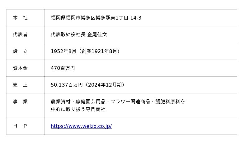 食・農業を通して、持続可能な社会と人々の暮しを豊かにする商品やサービスを提供する、農業資材・家庭園芸用品・フラワー関連商品・飼肥料原料を中心に取り扱う専門商社です。2022年で創業 101 年を迎えたニチリウ永瀬は、2023年1月1日をもって、「株式会社welzo」に社名を変更。BtoB を中心としたビジネススタイルを築き、国内に24拠点を置いています。 社内外のビジネスパートナーと共創し、ITやAIの技術を活用しながら、日本が直面する課題にも積極的に取り組んでいます。