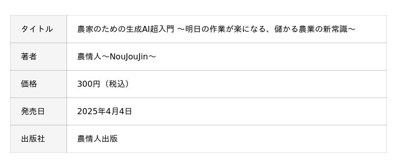 農業の課題解決を支援する「株式会社農情人(本社:千葉県船橋市、代表取締役:甲斐雄一郎)」は、書籍『農家のための生成AI超入門 ~明日の作業が楽になる、儲かる農業の新常識~』を、3日間限定でAmazon Kindleストアにて無料提供するキャンペーンを実施します。