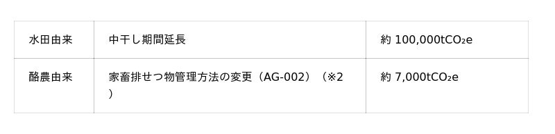 J-クレジット制度で承認されているメタン排出量削減の方法論。一般に水を張った水田はメタンが発生しやすいため、水稲栽培において通常行われる中干し期間を7日間延長することにより、メタン発生量を3割削減できることが確認されている