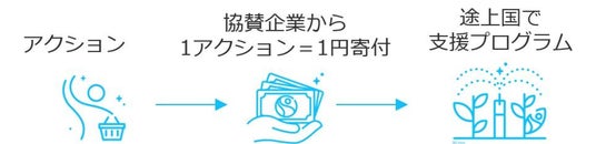 商品購入やSNS投稿など1アクション=1円が寄付に。