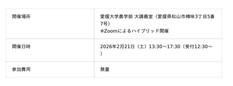 本シンポジウムは、環境再生型かんきつ農業の実践と、その科学的根拠を共有し、果樹園を核とした土壌炭素貯留、バイオ炭利用、森林・水田との連携による地域循環型ゼロカーボン農業の可能性を学術的・社会的に議論することを目的とします。