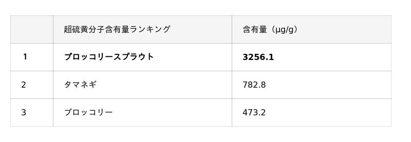 これまでの研究により、超硫黄分子を最も豊富に含む食材がブロッコリースプラウトであることが明らかになっています(※2)。ブロッコリースプラウトは、体の抗酸化力や解毒力をサポートする有用成分「スルフォラファン」を豊富に含むことで知られ、健康に寄与する野菜として高い評価を受けています。一方で、超硫黄分子は非常に多様な物質群であり、その具体的な種類や構造、健康への作用については未解明な部分が多く残されています。