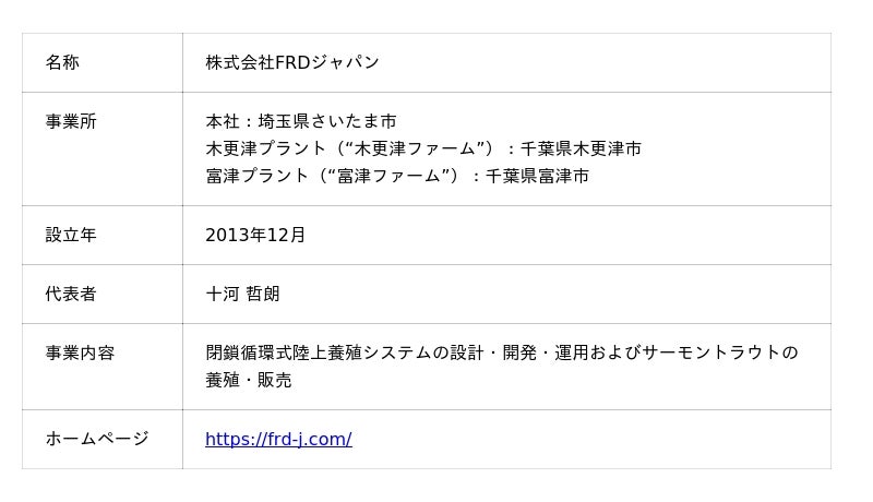 株式会社FRDジャパン(本社:埼玉県さいたま市、代表取締役:十河哲朗、以下「当社」)は、千葉県富津市で建設中のサーモントラウト陸上養殖商業プラント(“富津ファーム”)[1]の一部完成引き渡しを受け、操業を開始したことをお知らせします。
