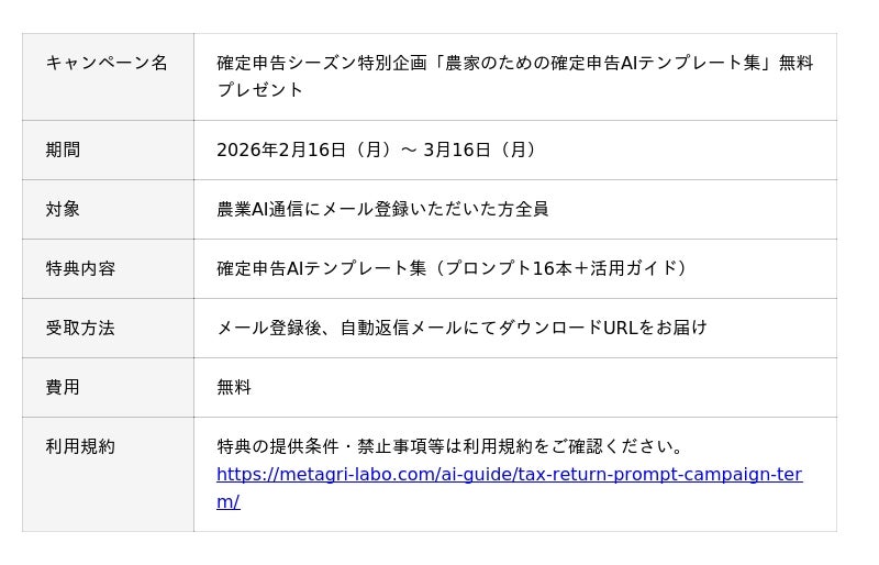 農業×新技術を推進する株式会社農情人(本社:千葉県船橋市、代表取締役:甲斐雄一郎)は、農家向け特化型AIメディア『農業AI通信』にて、確定申告シーズンがスタートする2026年2月16日(月)より、メール登録者向けの無料プレゼントキャンペーンを開始します。キャンペーン期間中にメール登録いただいた方全員へ、『農家のための確定申告AIテンプレート集』を無料で配布します。