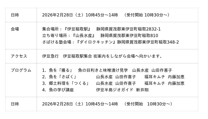 一般社団法人 海のごちそう推進機構と株式会社Dプランは、魚を実際にさばくこと、地域の海洋変化や魚種の変遷を学ぶこと、さらに地域の郷土料理に根差した調理体験など、日本の豊かな海の食文化を継承し輪を広げるイベント「日本さばける塾 in 稲取」を2月28日(土)に開催いたします。