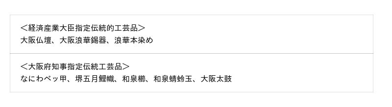 堺打刃物、大阪泉州桐箪笥、いずみガラス、漆刷毛、なにわ刷毛、大阪三味線、大阪銅器