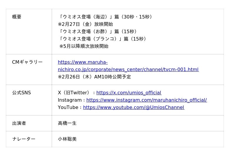 マルハニチロ株式会社(本社所在地:東京都江東区、代表取締役社長:池見 賢)は、俳優の高橋一生さんが出演する、Umiosとして初の企業CMである「ウミオス登場(海辺)」篇、「ウミオス登場(お酢)」篇、「ウミオス登場(ブランコ)」篇を2026年2月27日(金)より全国にて順次放送いたします。