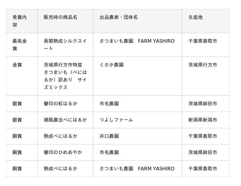 一般社団法人 日本野菜ソムリエ協会(東京都渋谷区、代表理事:福井栄治、以下当協会)は、2026年2月25日(水)に、農産物のさらなる価値向上を目指す青果物の品評会イベントとして「第2回全国焼き芋(サツマイモ)選手権」(以下、本選手権)を2年越しに開催しました。全国から集まったおいしさ自慢のサツマイモ・焼き芋全77品(サツマイモ部門37品・焼き芋部門40品)の中から、評価員である野菜ソムリエが産地や品種、生産者などの情報をすべて伏せて食味。そのおいしさを審査し、もっともおいしい「焼き芋(サツマイモ)」を決定しました。審査の結果、サツマイモ部門は、さつまいも農園 FARM YASHIRO(千葉県香取市)「長期熟成シルクスイート」。焼き芋部門 は、藤沢焼き芋ちちずいも(千葉県香取市)「べにはるか」が日本一に輝きました。