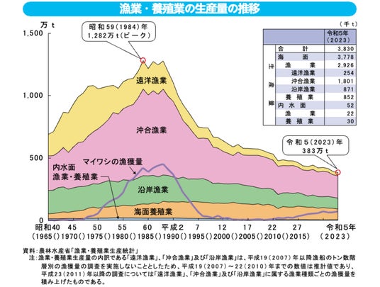 日本は海に囲まれた島国という立地から、古くより魚介を使った料理が豊富で、世界でも有数の洗練された魚食文化を築いてきました。一方で、2023年の漁業・養殖業生産量は383万トン(※1)と、ピークだった1984年の1,282万トン(※2)と比べて1/3以下に落ち込んでいます。私たちの食文化の根幹をなす魚が、このままでは食卓から消えてしまいかねない状況です。