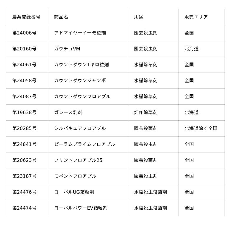 本合意は、バイエル社とのパートナーシップ強化および当社の国内農薬事業強化を目的としており、バイエル社が全国農業協同組合連合会またはホクレン農業協同組合連合会に販売している製品の一部(計12品目)を当社へ移管するものです。