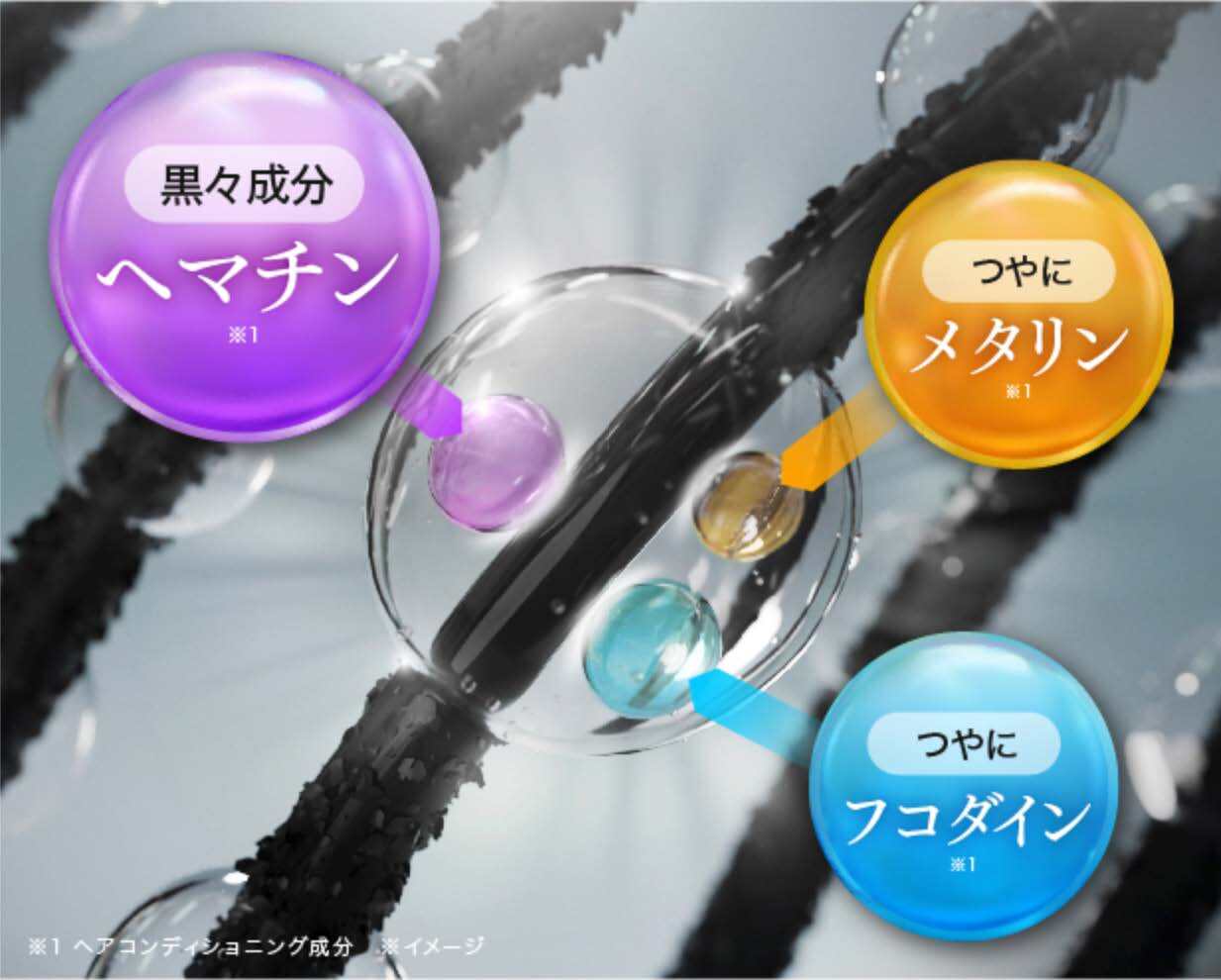 白髪染めなどで痛んだ髪を潤うつや髪へ導くため、ヘマチンをはじめとした3つの成分(ヘマチン、メリタン、フコイダン)を贅沢に配合。
